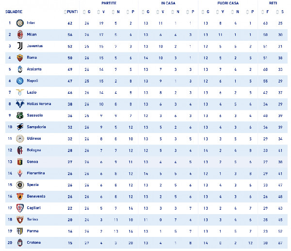 In questa sezione puoi trovare tutte le notizie sul calcio serie a, le curiosità sulla tua squadra preferita e tutte le notizie di calciomercato su juventus, napoli, milan, inter, roma, lazio e molte altre. Classifica 1°t serie a 2020/2021. Di seguito troverai sempre la classifica aggiornata turno dopo turno, sino al 23 maggio 2021, giorno della 38esima e ultima giornata. Serie a in tempo reale: Non ci sono classifiche disponibili.